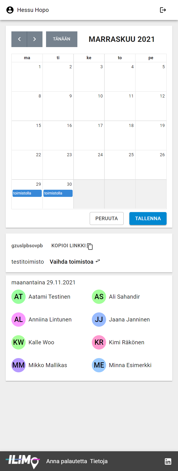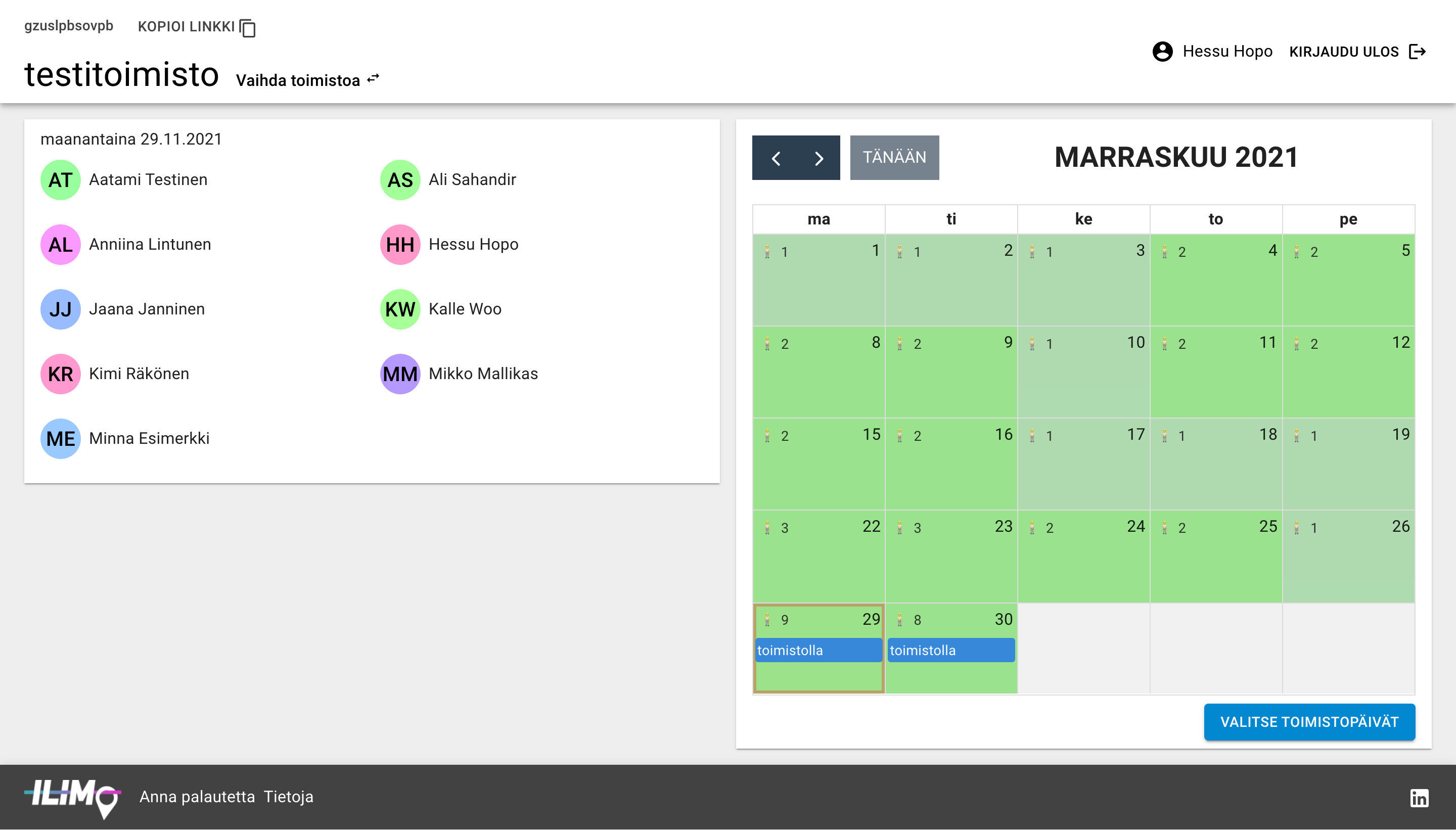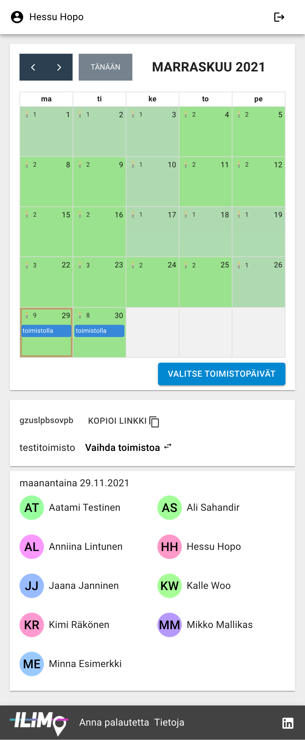 Ilimo on aputyökalu, jolla voit ilmoittaa toimistolla paikallaolopäivät ja tarkistaa milloin muut työkaverisi ovat paikalla. Ilimo myös huolehtii toimistosi paikkarajoituksista.